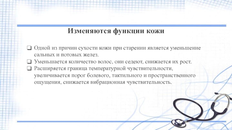 30 до 80 лет толщина эпидермиса уменьшается на 25%. Подкожно- жировая клетчатка истончается или исчезает, уменьшаются эластические свойства кожи и ее тургор. Кожа становится дряблой и морщинистой.