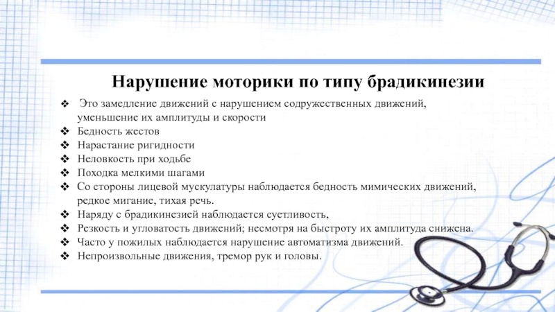 Резкость и угловатость движений; несмотря на быстроту их амплитуда снижена.