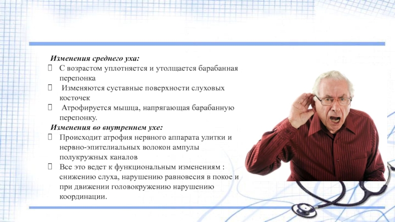 Все это ведет к функциональным изменениям : снижению слуха, нарушению равновесия в покое и при движении головокружению нарушению координации.