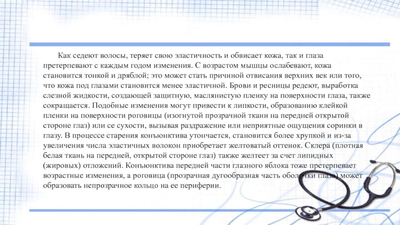 изменения. С возрастом мышцы ослабевают, кожа становится тонкой и дряблой; это может стать причиной отвисания верхних век или того, что кожа под глазами становится менее эластичной. Брови и ресницы редеют, выработка слезной жидкости, создающей защитную, маслянистую пленку на поверхности глаза, также сокращается. Подобные изменения могут привести к липкости, образованию клейкой пленки на поверхности роговицы (изогнутой прозрачной ткани на передней открытой стороне глаз) или се сухости, вызывая раздражение или неприятные ощущения соринки в глазу. В процессе старения конъюнктива утончается, становится более хрупкой и из-за увеличения числа эластичных волокон приобретает желтоватый оттенок. Склера (плотная белая ткань на передней, открытой стороне глаз) также желтеет за счет липидных (жировых) отложений. Конъюнктива передней части глазного яблока тоже претерпевает возрастные изменения, а роговица (прозрачная дугообразная часть оболочки глаза) может образовать непрозрачное кольцо на ее периферии.