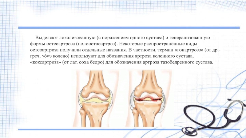 генерализованную формы остеоартроза (полиостоеартроз). Некоторые распространённые виды остеоартроза получили отдельные