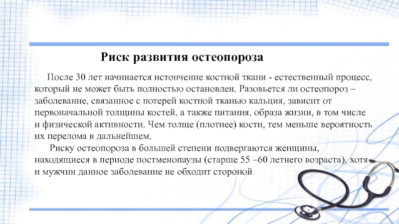 Риску остеопороза в большей степени подвергаются женщины, находящиеся в периоде постменопаузы (старше 55 –60 летнего возраста), хотя и мужчин данное заболевание не обходит стороной