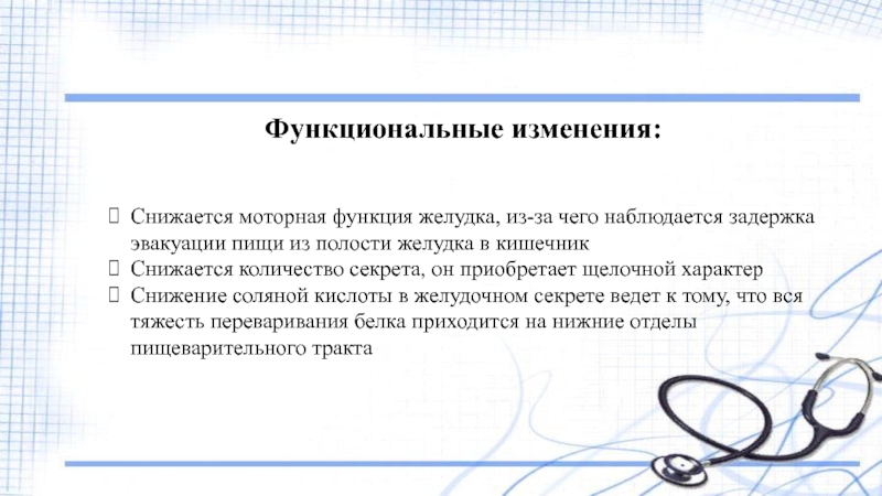 Снижается моторная функция желудка, из-за чего наблюдается задержка эвакуации