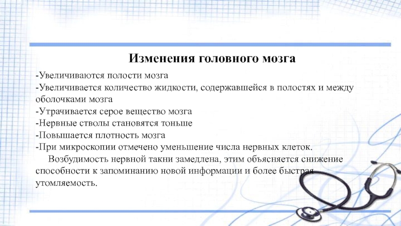 Возбудимость нервной такни замедлена, этим объясняется снижение способности к запоминанию новой информации и более быстрая утомляемость.