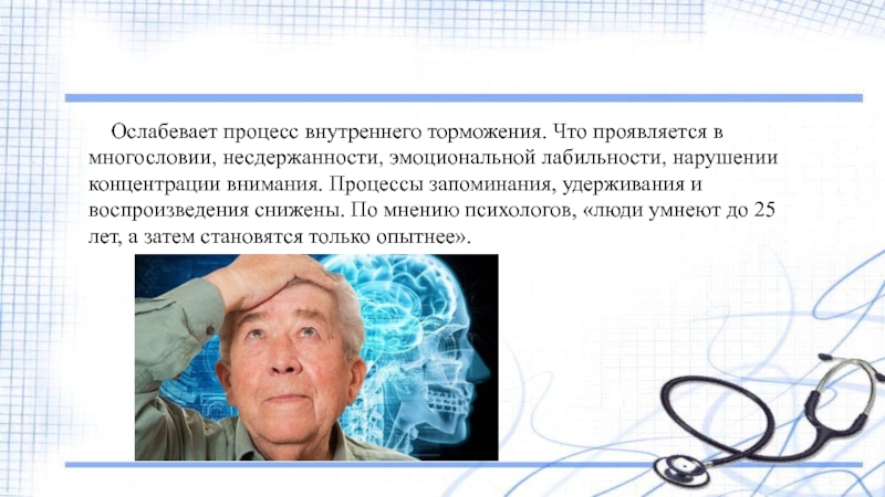 и воспроизведения снижены. По мнению психологов, «люди умнеют до 25 лет, а затем становятся только опытнее».