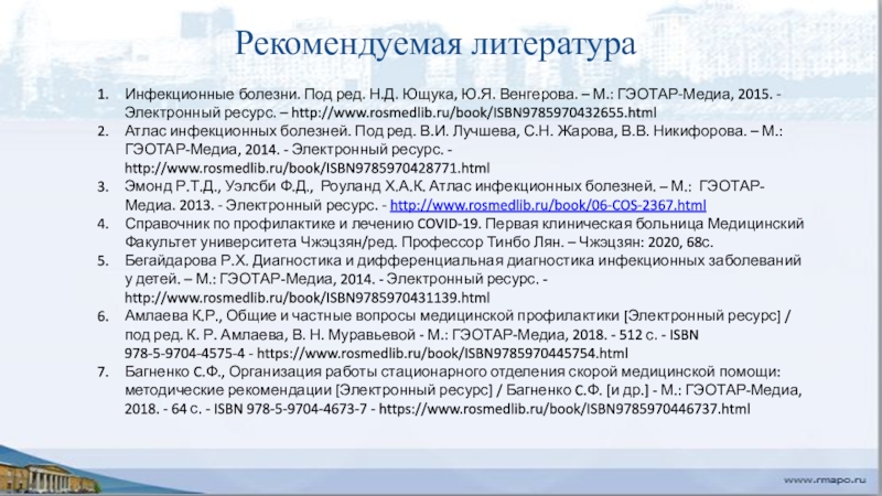Бегайдарова Р.Х. Диагностика и дифференциальная диагностика инфекционных заболеваний у детей. – М.: ГЭОТАР-Медиа, 2014. - Электронный ресурс. - http://www.rosmedlib.ru/book/ISBN9785970431139.html