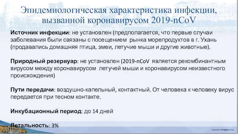Слайд 12Эпидемиологическая характеристика инфекции, вызванной коронавирусом 2019-nCoV