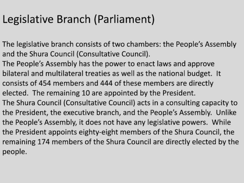 The Shura Council (Consultative Council) acts in a consulting capacity to the President, the executive branch, and the People’s Assembly. Unlike the People’s Assembly, it does not have any legislative powers. While the President appoints eighty-eight members of the Shura Council, the remaining 174 members of the Shura Council are directly elected by the people.
