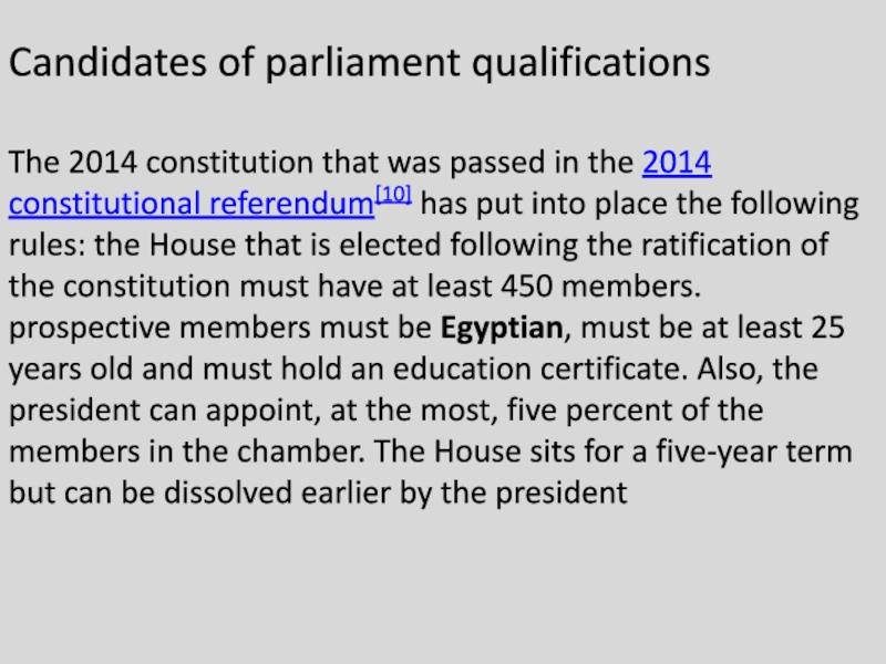 prospective members must be Egyptian, must be at least 25 years old and must hold an education certificate. Also, the president can appoint, at the most, five percent of the members in the chamber. The House sits for a five-year term but can be dissolved earlier by the president