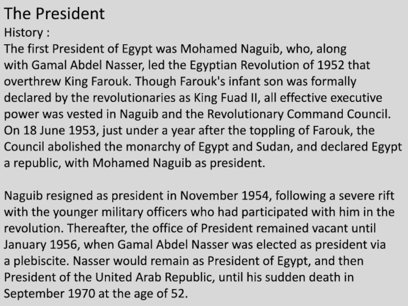 Слайд 4The president of Egypt is the executive head of state of Egypt. Under the various