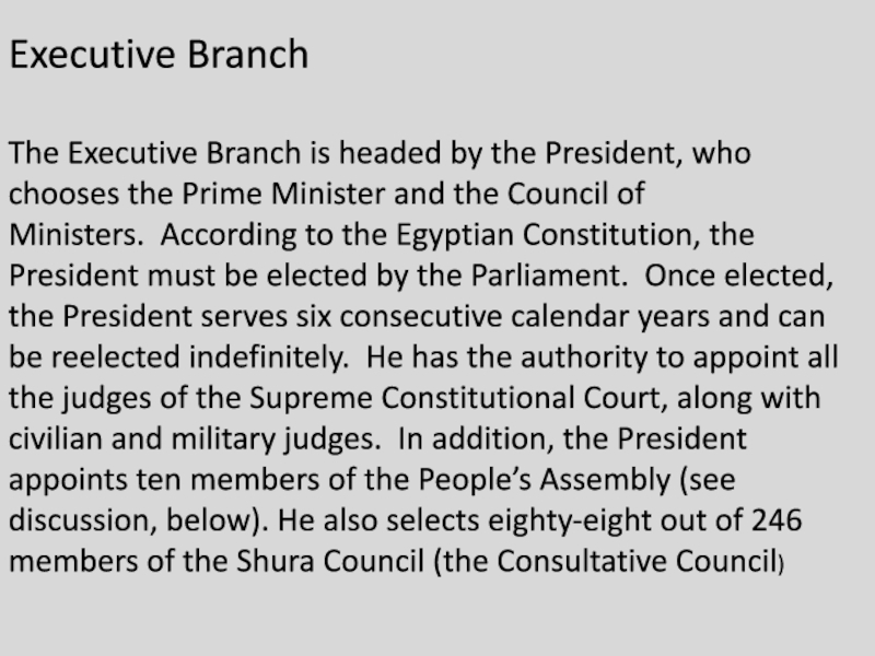 to the Egyptian Constitution, the President must be elected by the Parliament. Once elected, the President serves six consecutive calendar years and can be reelected indefinitely. He has the authority to appoint all the judges of the Supreme Constitutional Court, along with civilian and military judges. In addition, the President appoints ten members of the People’s Assembly (see discussion, below). He also selects eighty-eight out of 246 members of the Shura Council (the Consultative Council)