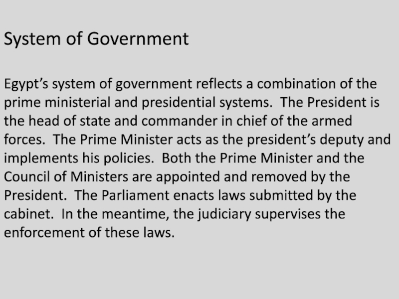 head of state and commander in chief of the armed forces. The Prime Minister acts as the president’s deputy and implements his policies. Both the Prime Minister and the Council of Ministers are appointed and removed by the President. The Parliament enacts laws submitted by the cabinet. In the meantime, the judiciary supervises the enforcement of these laws.