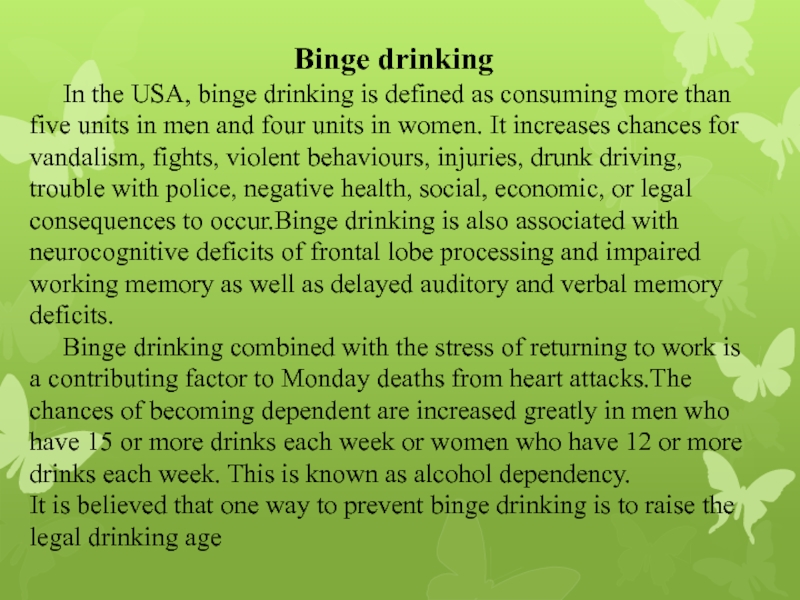 Binge drinking combined with the stress of returning to work is a contributing factor to Monday deaths from heart attacks.The chances of becoming dependent are increased greatly in men who have 15 or more drinks each week or women who have 12 or more drinks each week. This is known as alcohol dependency.