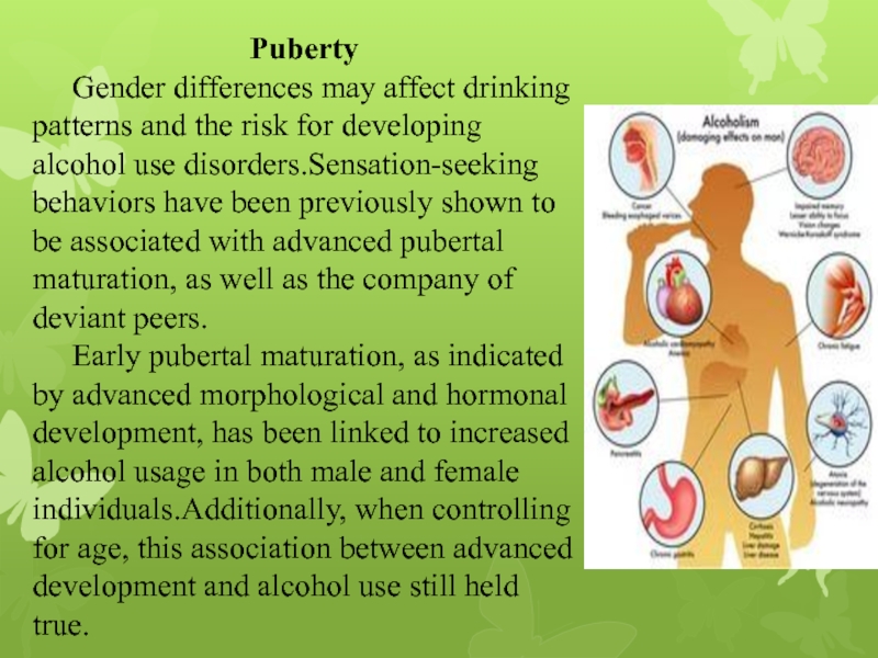 Early pubertal maturation, as indicated by advanced morphological and hormonal development, has been linked to increased alcohol usage in both male and female individuals.Additionally, when controlling for age, this association between advanced development and alcohol use still held true.