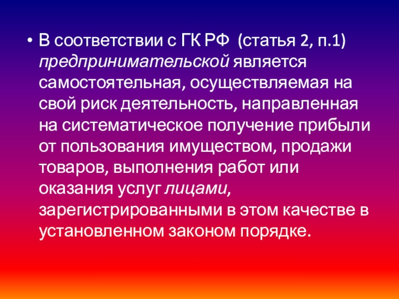 Слайд 4В соответствии с ГК РФ (статья 2, п.1) предпринимательской является