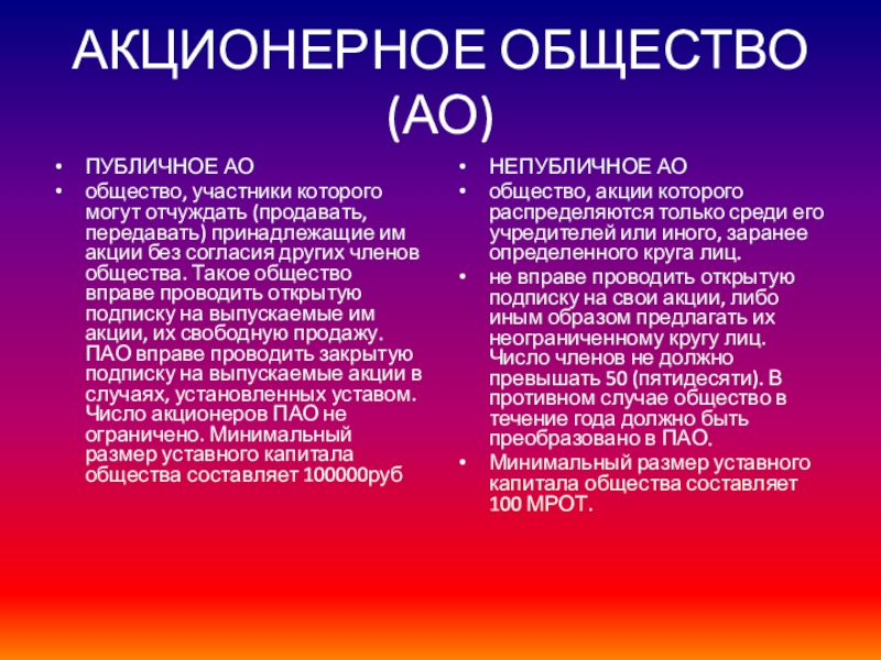 вправе проводить открытую подписку на выпускаемые им акции, их свободную продажу. ПАО вправе проводить закрытую подписку на выпускаемые акции в случаях, установленных уставом. Число акционеров ПАО не ограничено. Минимальный размер уставного капитала общества составляет 100000руб
