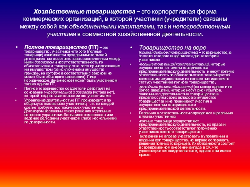 Хозяйственные товарищества – это корпоративная форма коммерческих организаций, в которой