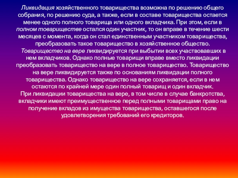 Слайд 15Ликвидация хозяйственного товарищества возможна по решению общего собрания, по решению