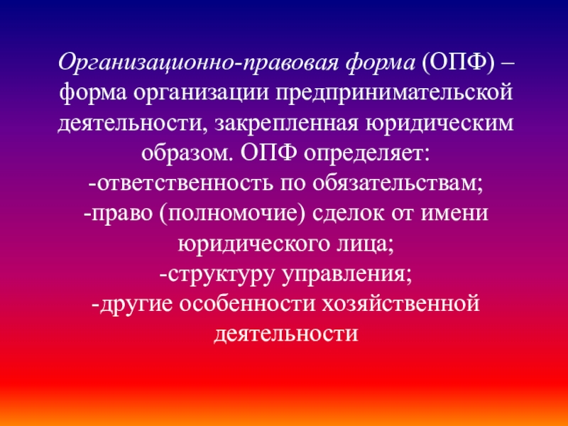 Слайд 5Организационно-правовая форма (ОПФ) – форма организации предпринимательской деятельности, закрепленная юридическим