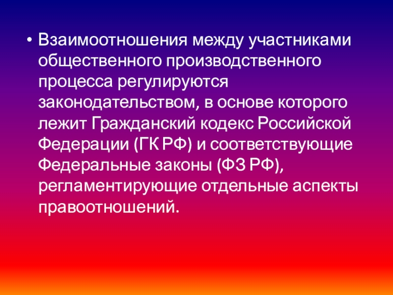 Слайд 3Взаимоотношения между участниками общественного производственного процесса регулируются законодательством, в основе