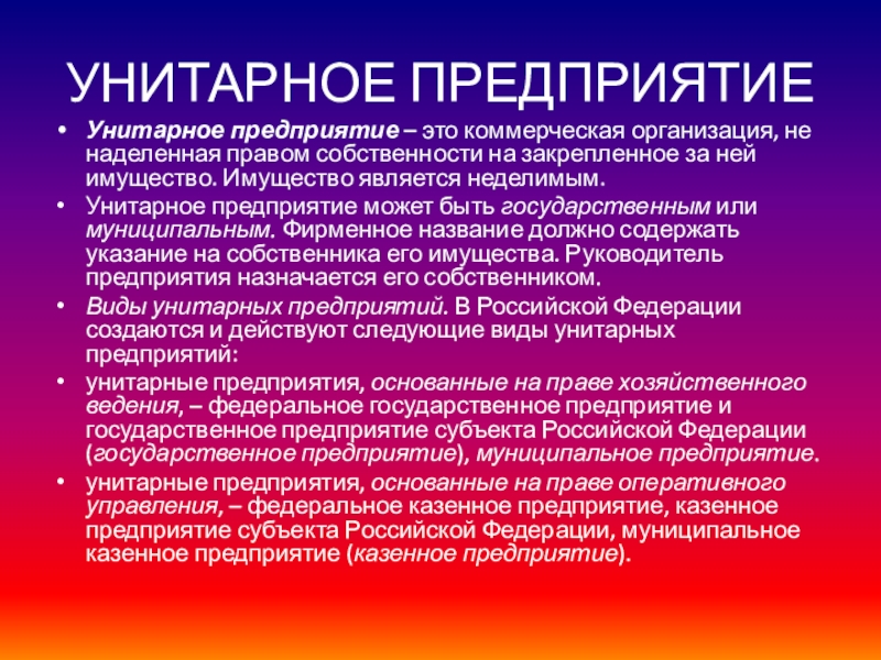 Слайд 26УНИТАРНОЕ ПРЕДПРИЯТИЕ