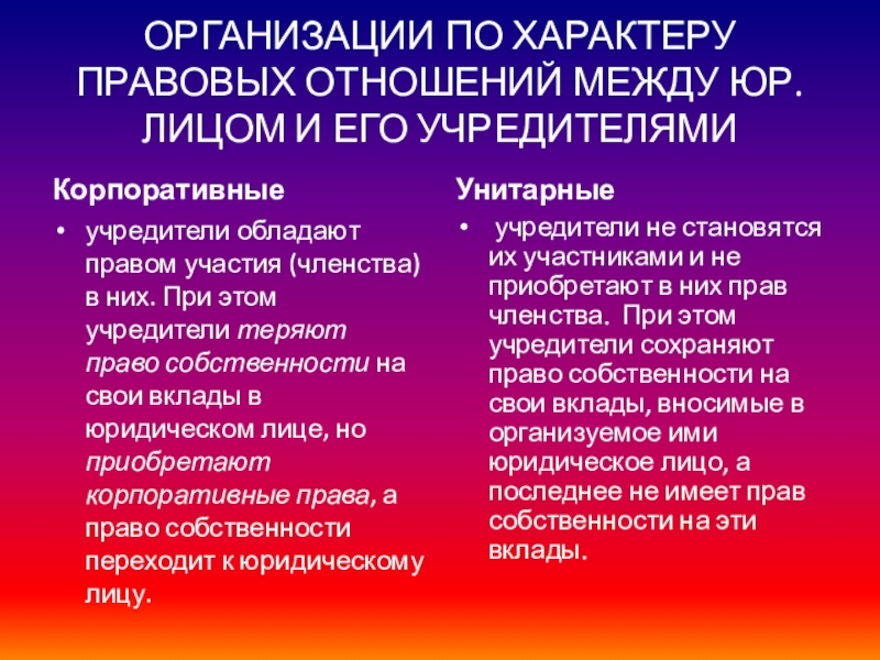 Слайд 12ОРГАНИЗАЦИИ ПО ХАРАКТЕРУ ПРАВОВЫХ ОТНОШЕНИЙ МЕЖДУ ЮР.ЛИЦОМ И ЕГО УЧРЕДИТЕЛЯМИ