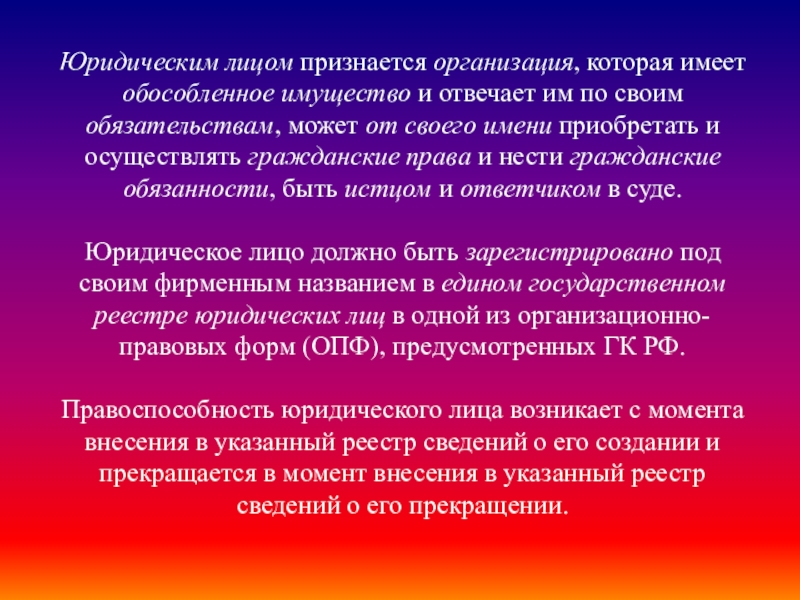 Слайд 6Юридическим лицом признается организация, которая имеет обособленное имущество и отвечает