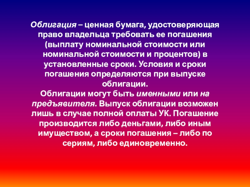 Слайд 24Облигация – ценная бумага, удостоверяющая право владельца требовать ее погашения