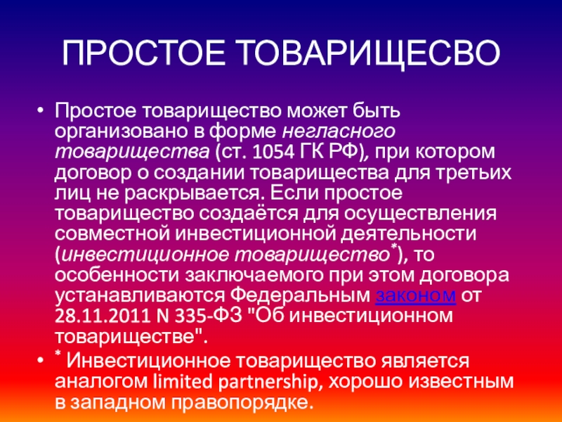 Инвестиционное товарищество является аналогом limited partnership, хорошо известным в западном правопорядке.