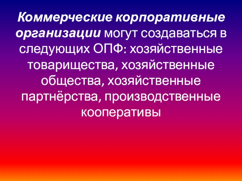 Слайд 13Коммерческие корпоративные организации могут создаваться в следующих ОПФ: хозяйственные товарищества,