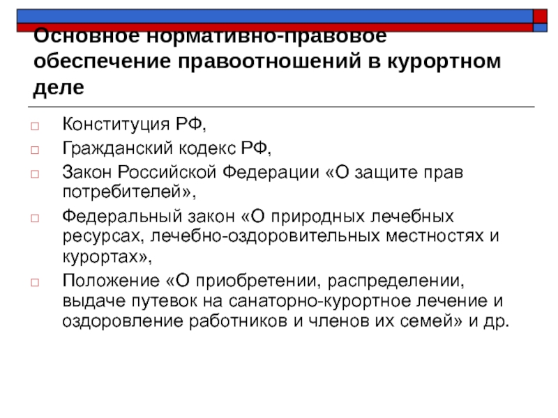 Слайд 10Основное нормативно-правовое обеспечение правоотношений в курортном деле