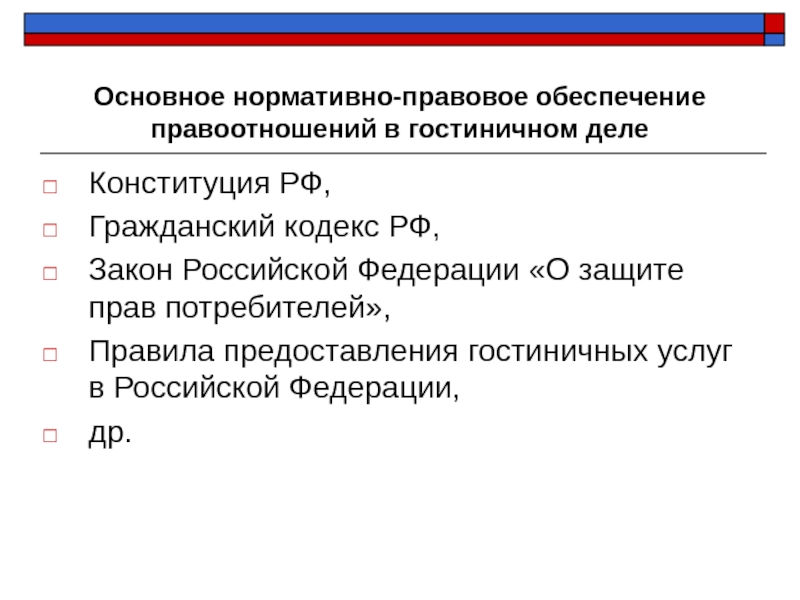 Слайд 9Основное нормативно-правовое обеспечение правоотношений в гостиничном деле