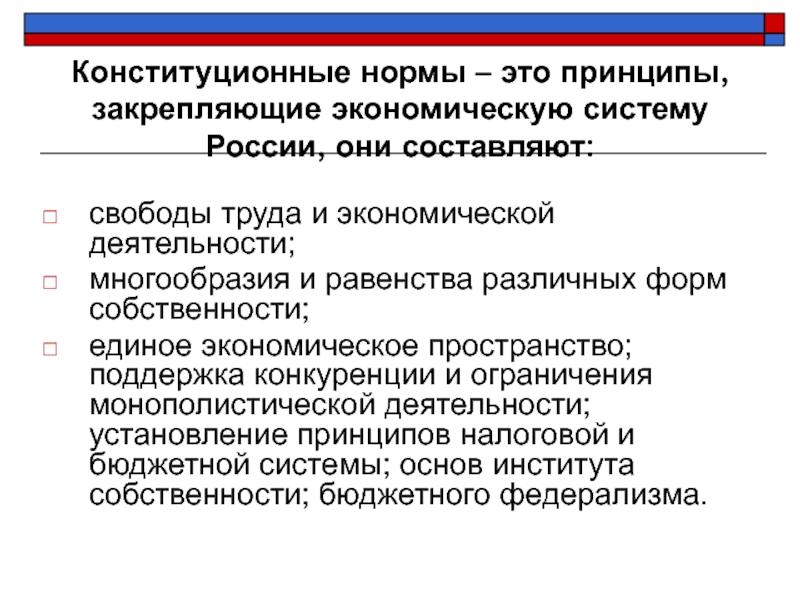 Слайд 13Конституционные нормы – это принципы, закрепляющие экономическую систему России, они