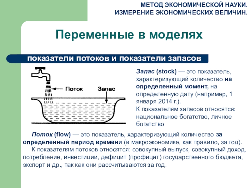 Запас (stock) — это показатель, характеризующий количество на определенный момент, на определенную дату (например, 1 января 2014 г.).