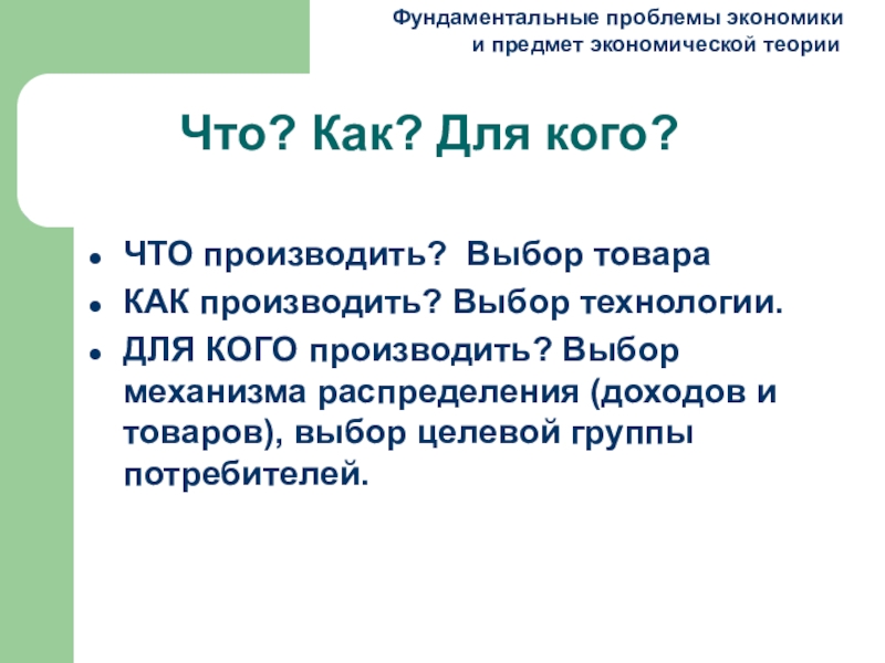 ДЛЯ КОГО производить? Выбор механизма распределения (доходов и товаров), выбор целевой группы потребителей.