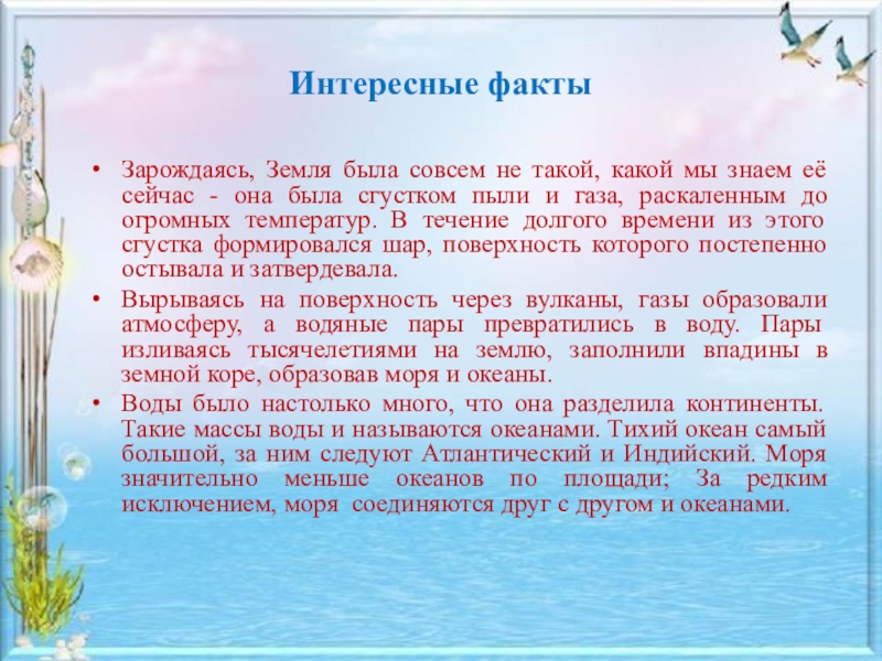 Воды было настолько много, что она разделила континенты. Такие массы воды и называются океанами. Тихий океан самый большой, за ним следуют Атлантический и Индийский. Моря значительно меньше океанов по площади; За редким исключением, моря соединяются друг с другом и океанами.