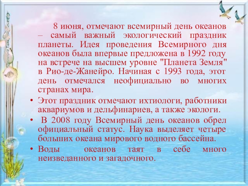 океанов – самый важный экологический праздник планеты. Идея проведения Всемирного