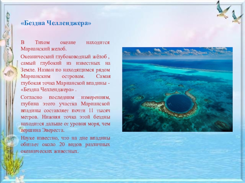 рядом Марианским островам. Самая глубокая точка Марианской впадины - «Бездна Челленджера» .