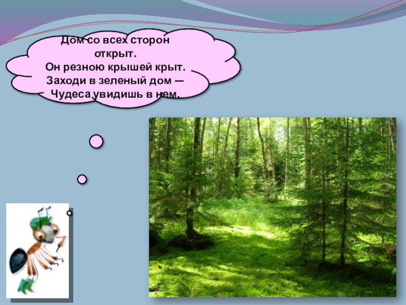 Дом со всех сторон открыт. Он резною крышей крыт. Заходи в зеленый дом — Чудеса увидишь в