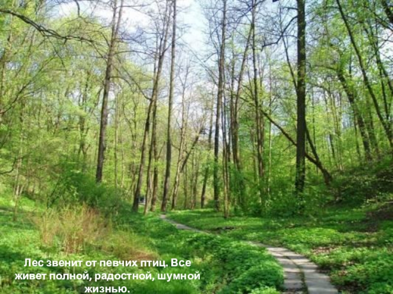 Слайд 18Лес звенит от певчих птиц. Все живет полной, радостной, шумной