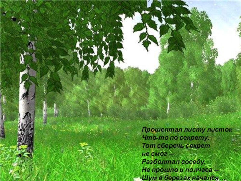 Прошептал листу листок  Что-то по секрету. Тот сберечь секрет не смог — Разболтал соседу. Не прошло и полчаса — Шум в березах начался…