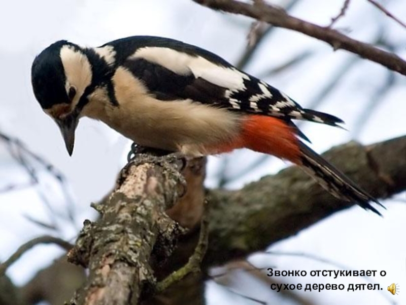 Слайд 11Звонко отстукивает о сухое дерево дятел.