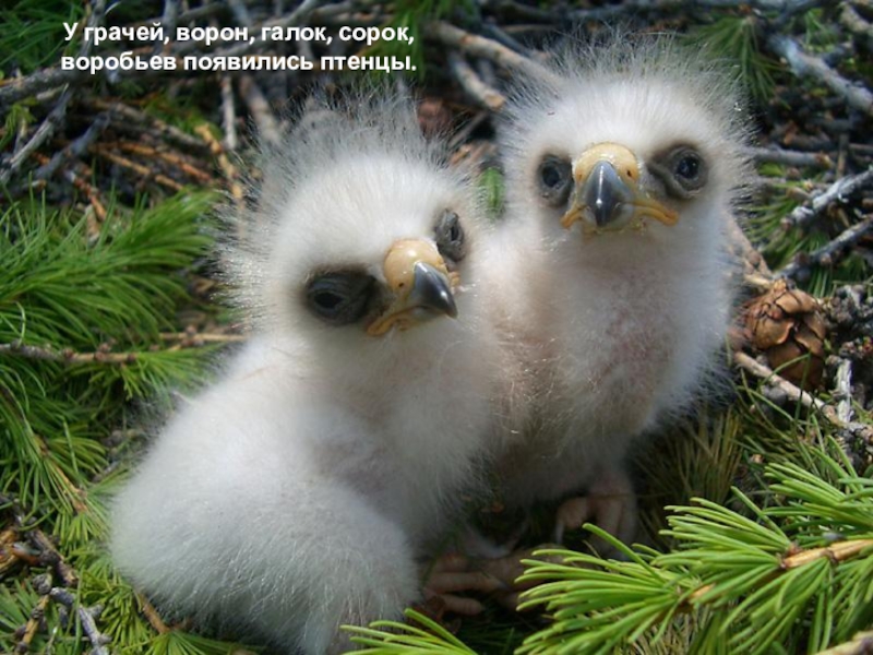 Слайд 16У грачей, ворон, галок, сорок, воробьев появились птенцы.