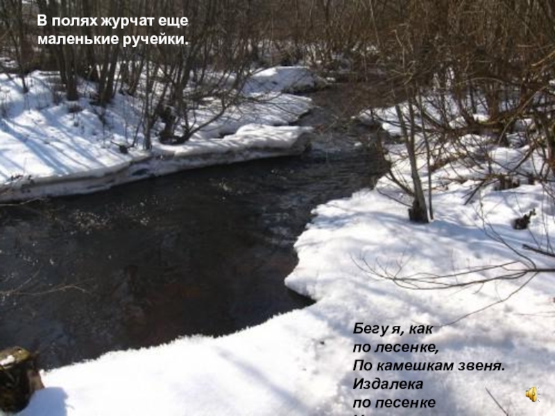 Бегу я, как по лесенке, По камешкам звеня. Издалека по песенке Узнаете меня.В полях журчат еще маленькие ручейки.