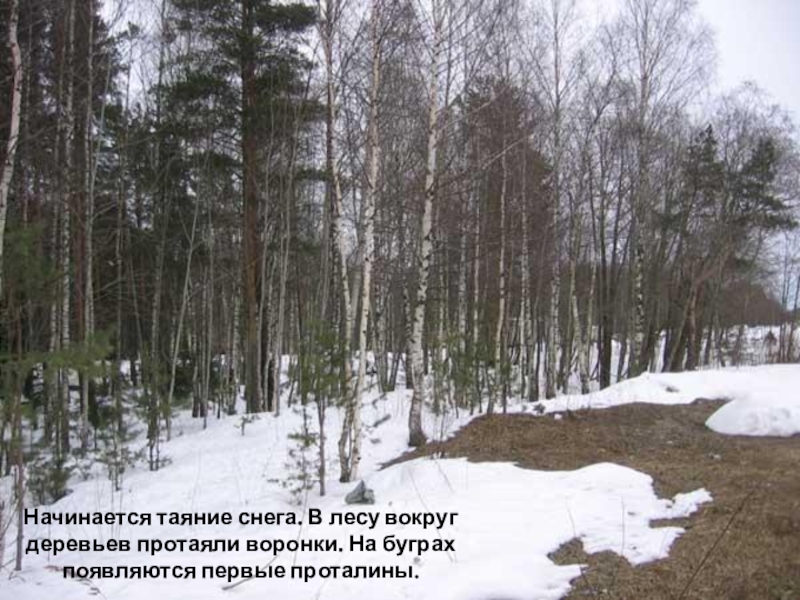 Слайд 6Начинается таяние снега. В лесу вокруг деревьев протаяли воронки. На