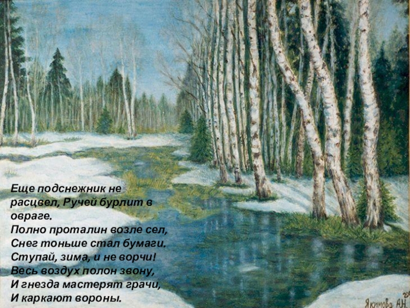 Еще подснежник не расцвел, Ручей бурлит в овраге.Полно проталин возле сел, Снег тоньше стал бумаги. Ступай, зима,