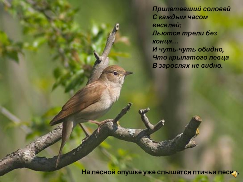 Слайд 9Прилетевший соловей С каждым часом веселей: Льются трели без конца… И чуть-чуть обидно, Что крылатого певца В зарослях