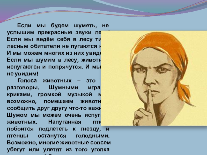 Слайд 19 Если мы будем шуметь, не услышим прекрасные звуки леса! Если