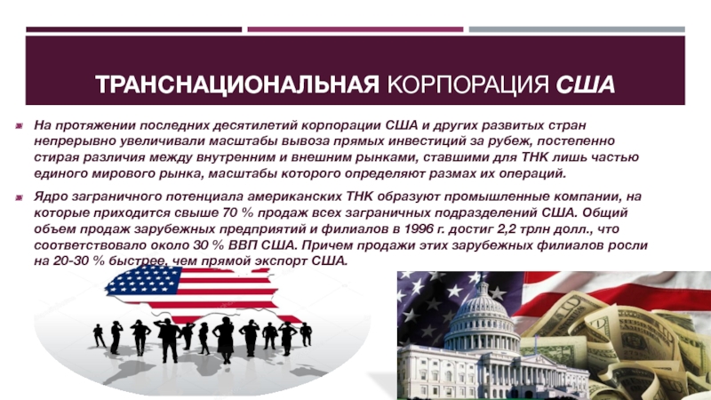 Ядро заграничного потенциала американских ТНК образуют промышленные компании, на которые приходится свыше 70 % продаж всех заграничных подразделений США. Общий объем продаж зарубежных предприятий и филиалов в 1996 г. достиг 2,2 трлн долл., что соответствовало около 30 % ВВП США. Причем продажи этих зарубежных филиалов росли на 20-30 % быстрее, чем прямой экспорт США.