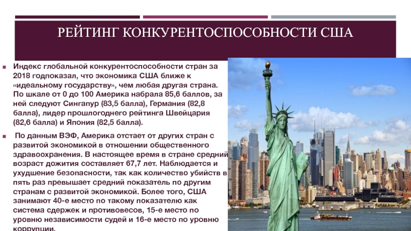 По шкале от 0 до 100 Америка набрала 85,6 баллов, за ней следуют Сингапур (83,5 балла), Германия (82,8 балла), лидер прошлогоднего рейтинга Швейцария (82,6 балла) и Япония (82,5 балла).